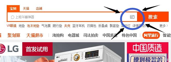 1、进入淘宝首页,点击如图相机图标上传自己拍的商品照片: