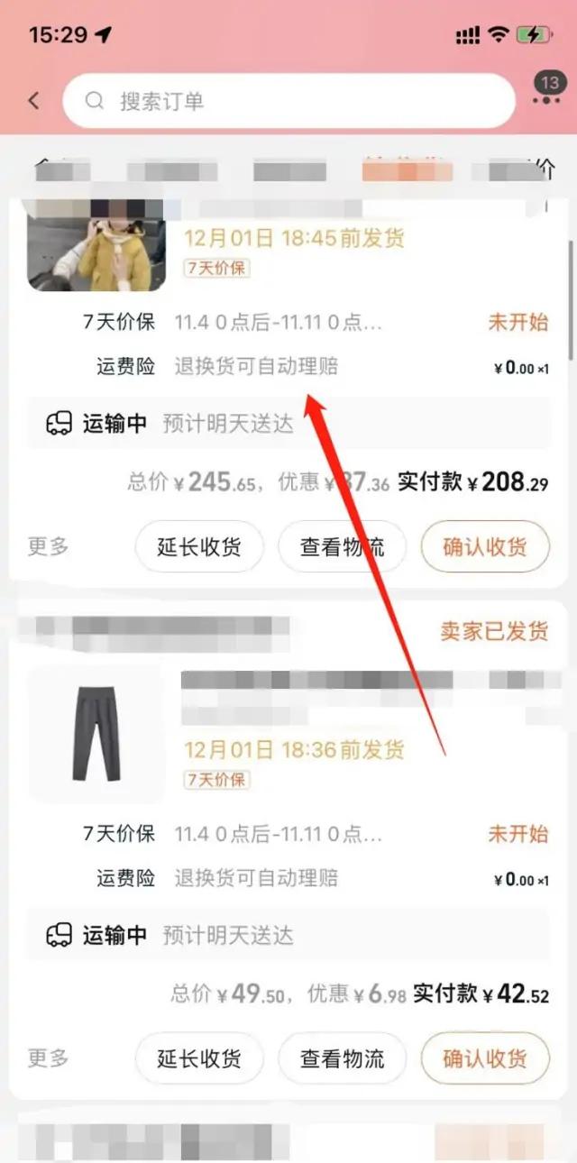 1、打开淘宝订单,找到带有价保的商品,点击查看订单详情;