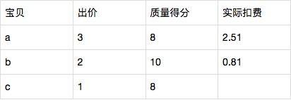 我们再来做个假设,三个商家的质量分都是依旧的8分,和第一个例子差不多,只是这个时候b提高了出价。