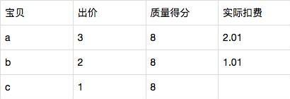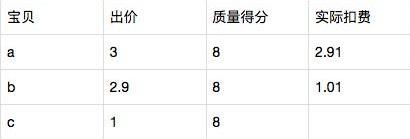 这个时候a的实际扣费就变成了2.9*8/8+0.01,比表1中上升了9毛钱,虽然这个时候b的出价比原来高了9毛钱,但是由于b的实际扣费是要取决于下一名的c的,c并没有发生任何变化,所以b的平均点击单价并不会因为自己提高出价而上升哦,还是一样的1.01元,看到这里,我相信我举得这3个例子大家已经看得非常明白了。