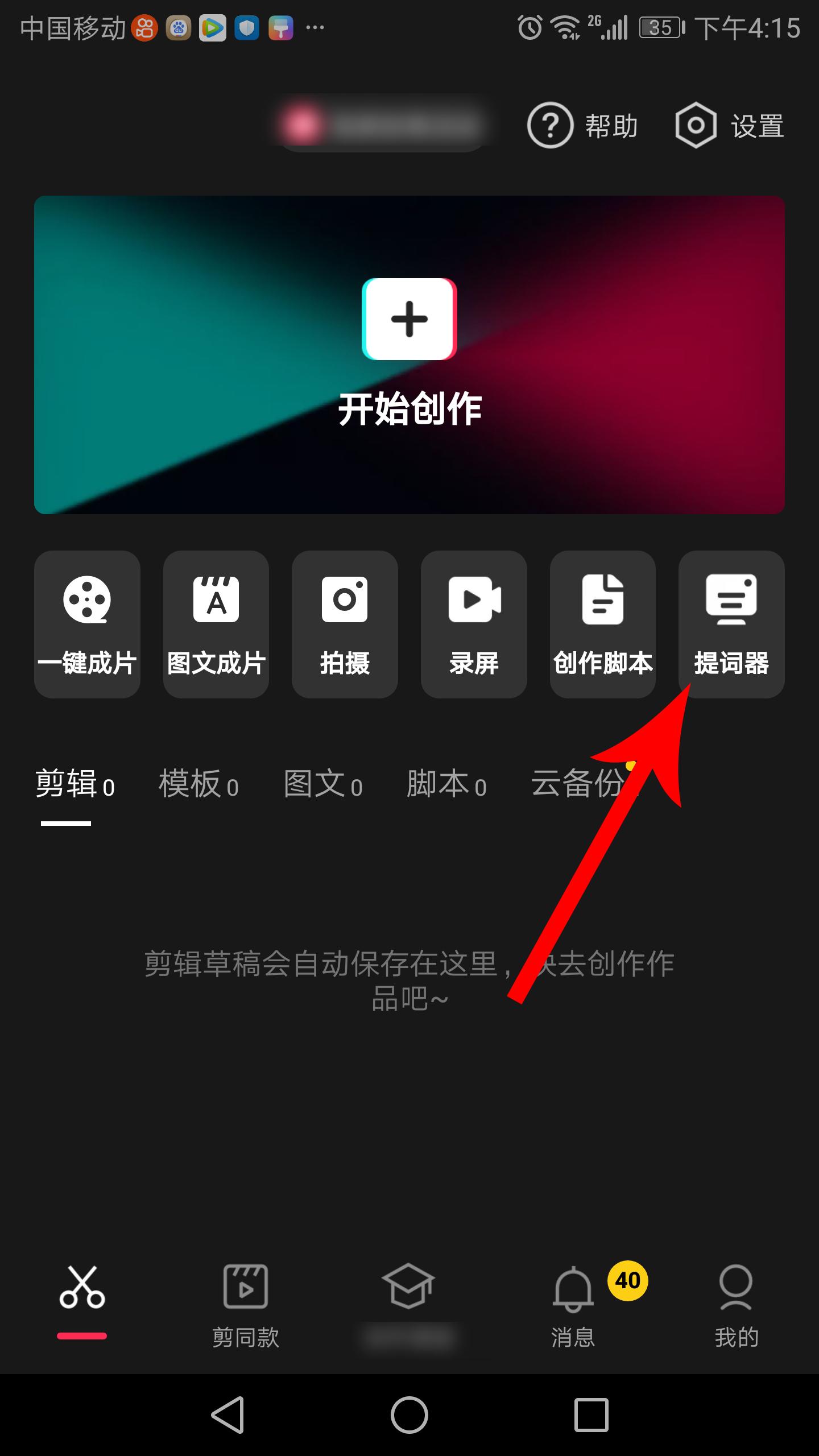 2,打开新版剪映后,首页工具栏中就会多出一个提词器工具,这时我们点击该工具。
