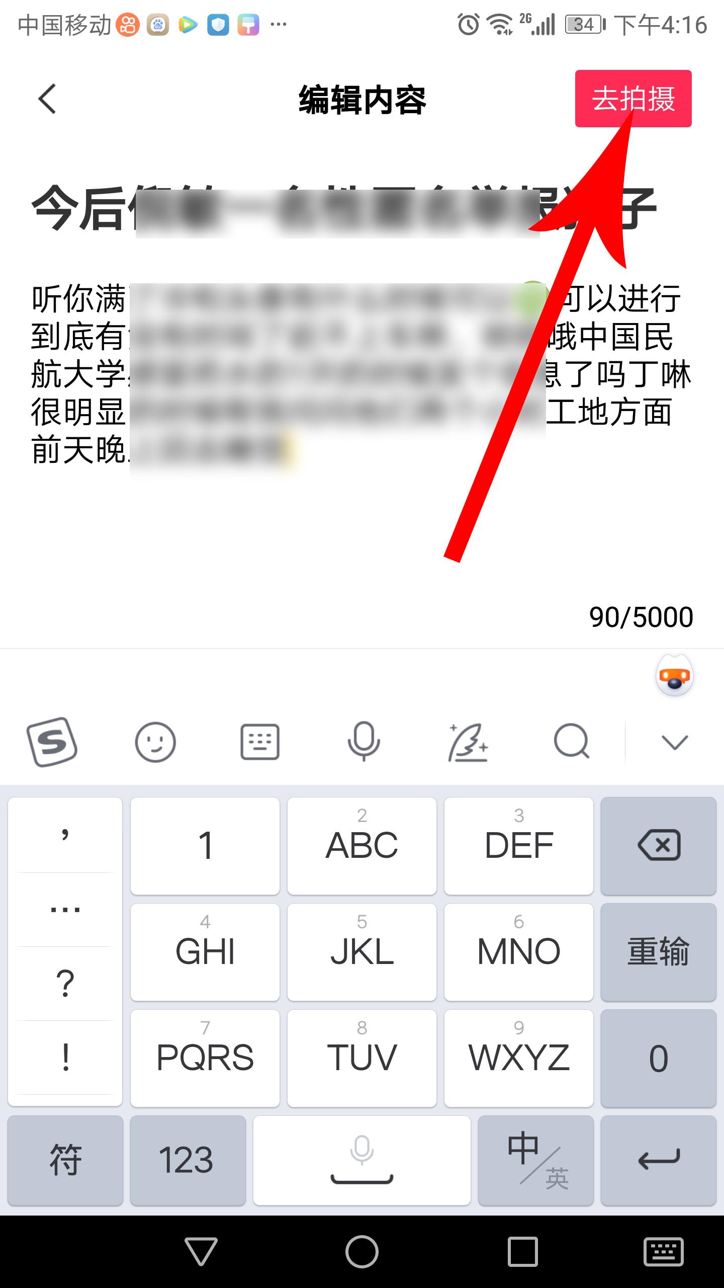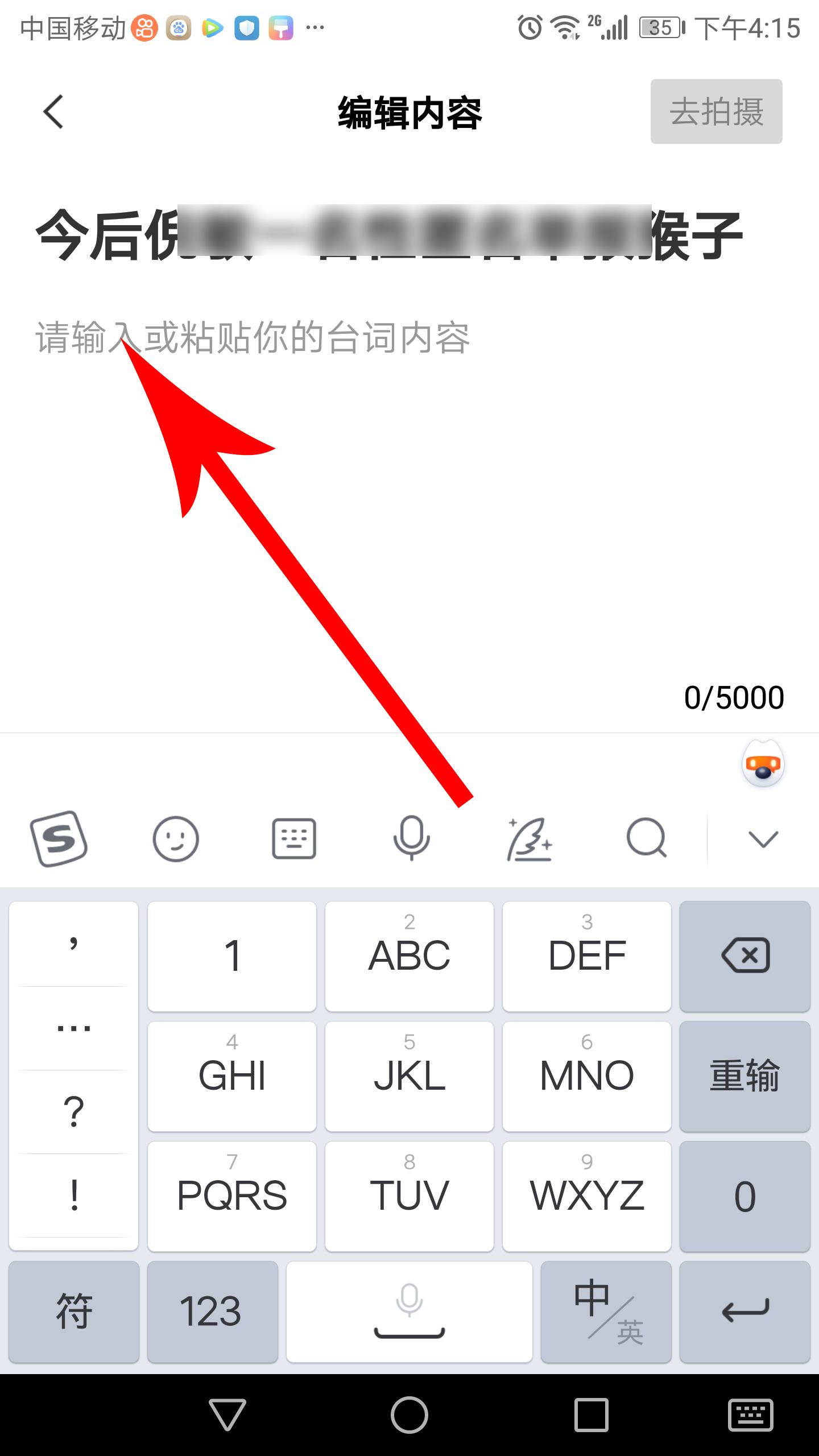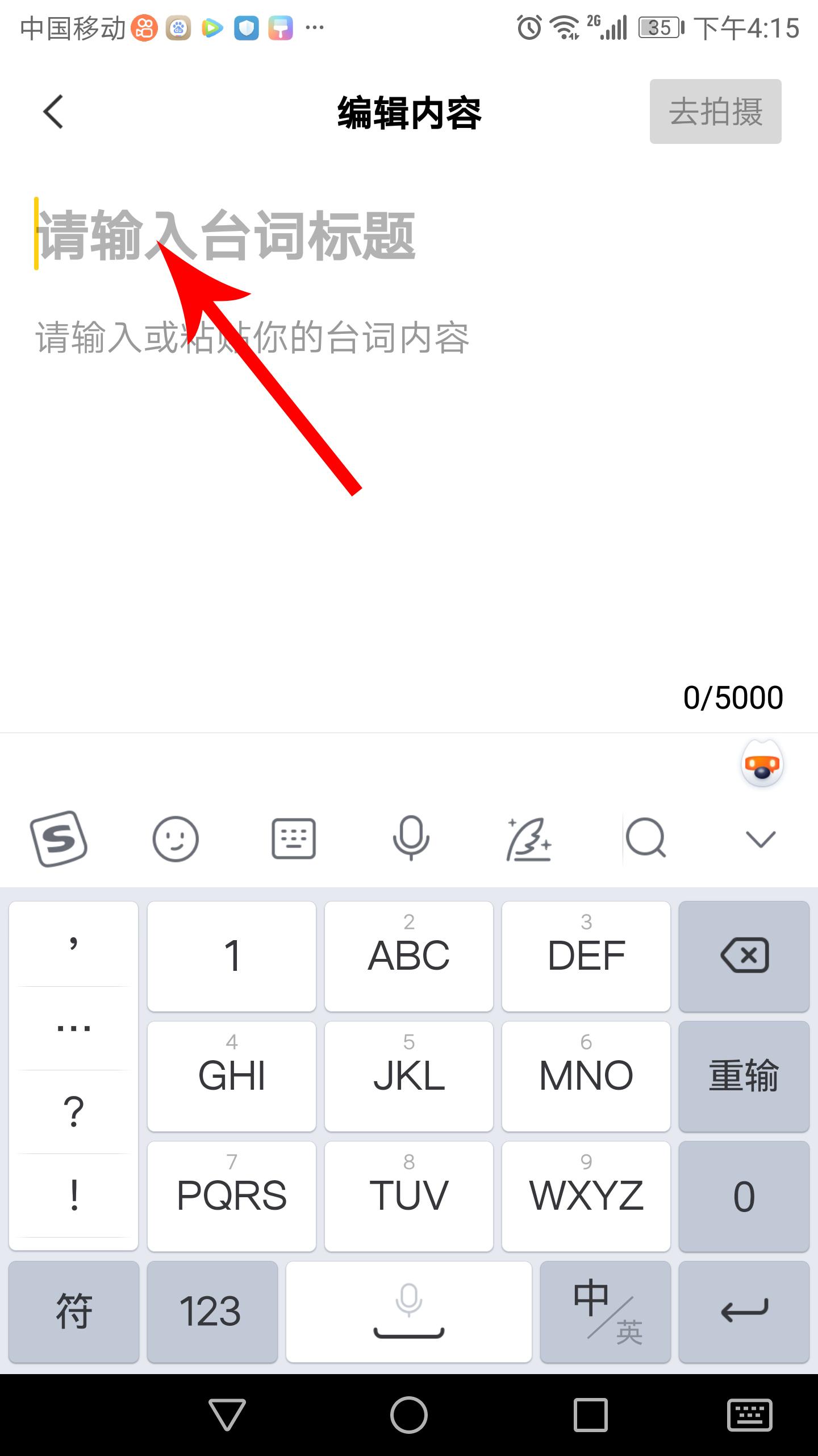 3,打开编辑内容界面,首先编辑台词标题。编辑完成后点击内文编辑区,开始编辑台词内文。标题、内文编辑完成后点击“去拍摄”。