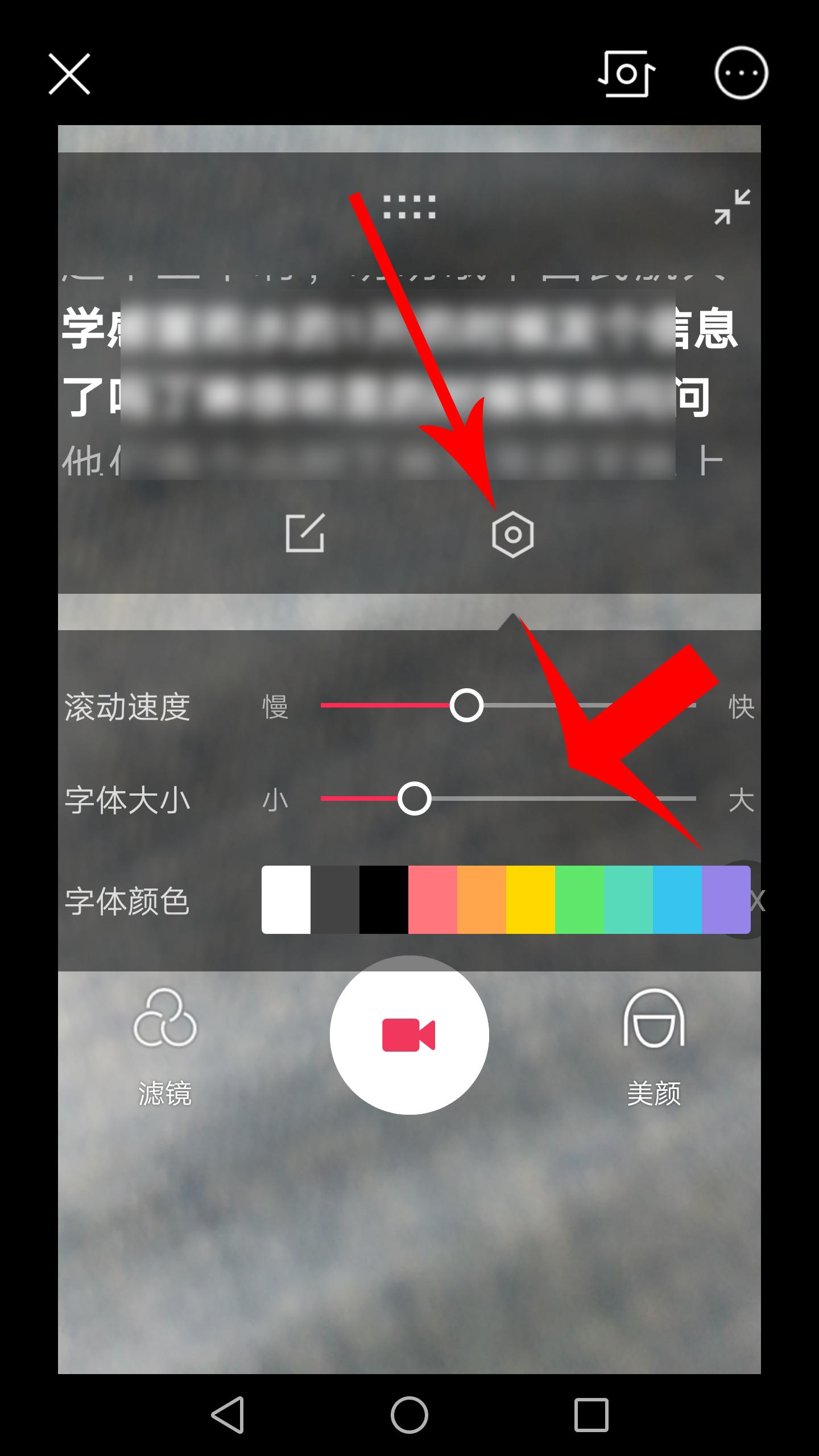 6,重新打开视频录制界面,在正式录制视频前,需要点击“设置”按钮,设置台词滚动速度、字号和字体颜色。这一过程需要反复多次进行修改,才能找出适合自己的设置。设置完毕后,再次点击“设置”图标,即可关闭设置对话框,点击其他位置是关闭不了的。