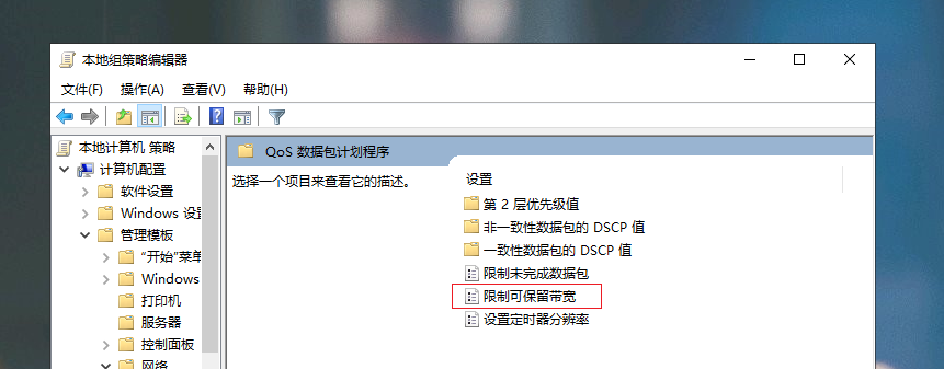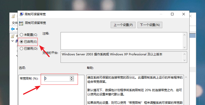 然后选择【限制可保留宽带】,进入后,把左上角默认的【未配置】改为【已启用】,把宽带限制设置为【0】,最后点击确定即可。