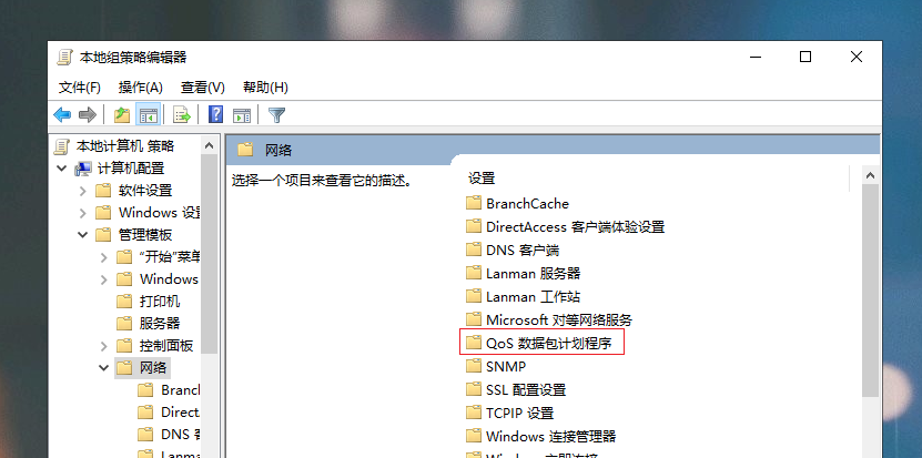 进入本地组策略编辑器,依次双击【计算机配置】-【管理模块】-【网络】-【Qos数据包计划程序】。