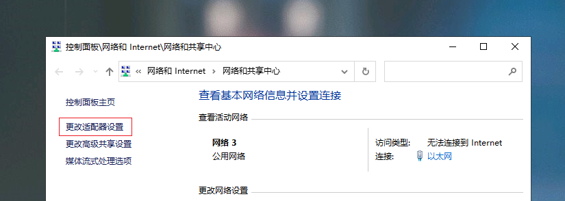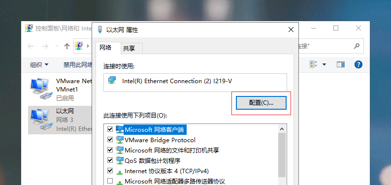 进入后,依次选择【更改适配器设置】-【以太网】-【属性】-【配置】(注:这里要求是有线的宽带网,无线的不适合这里的内容)。
