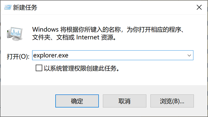 步骤3:新建的任务窗口中,在输入框输入“explorer.exe”,接着点击确定。你会发现,原本消失的电脑桌面图标都出来了。