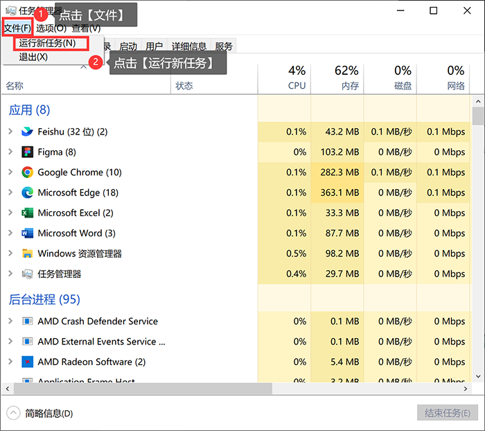 步骤2:在任务管理器中,点击【文件】,接着点击【运行新任务】。