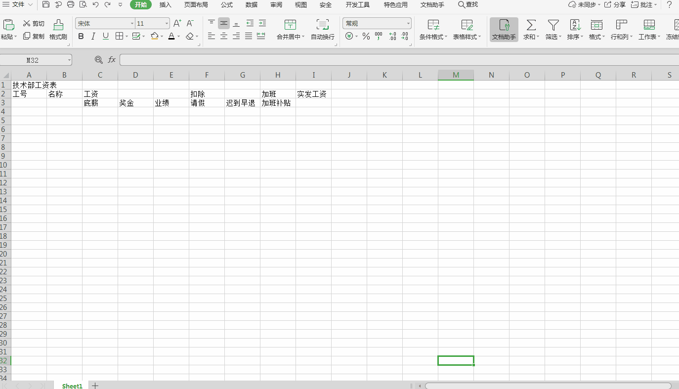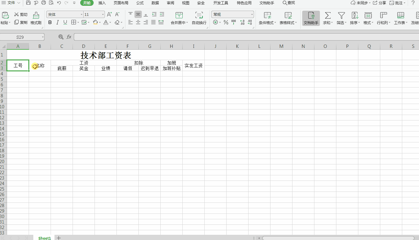 4、分别合并“工号”,“名称”,“实发工资”上下单元格,分别合并“工资”,“扣除”左右单元格,在合并单元格时可以选择要合并的单元格用快捷键Ctrl+M,或者点击“合并居中”,操作过程如下;