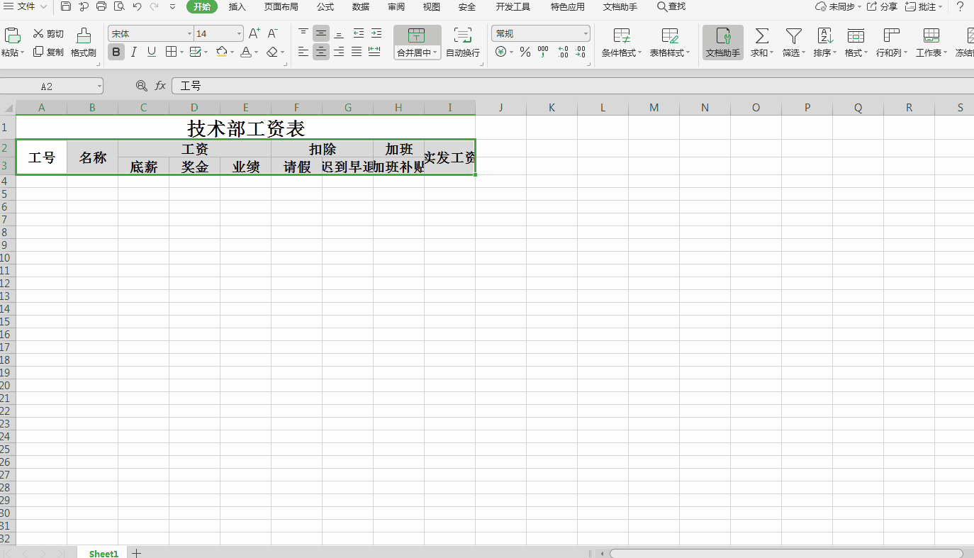 2、选择技术部工资表这行,然后“合并居中”,调节字体大小到合适大小;