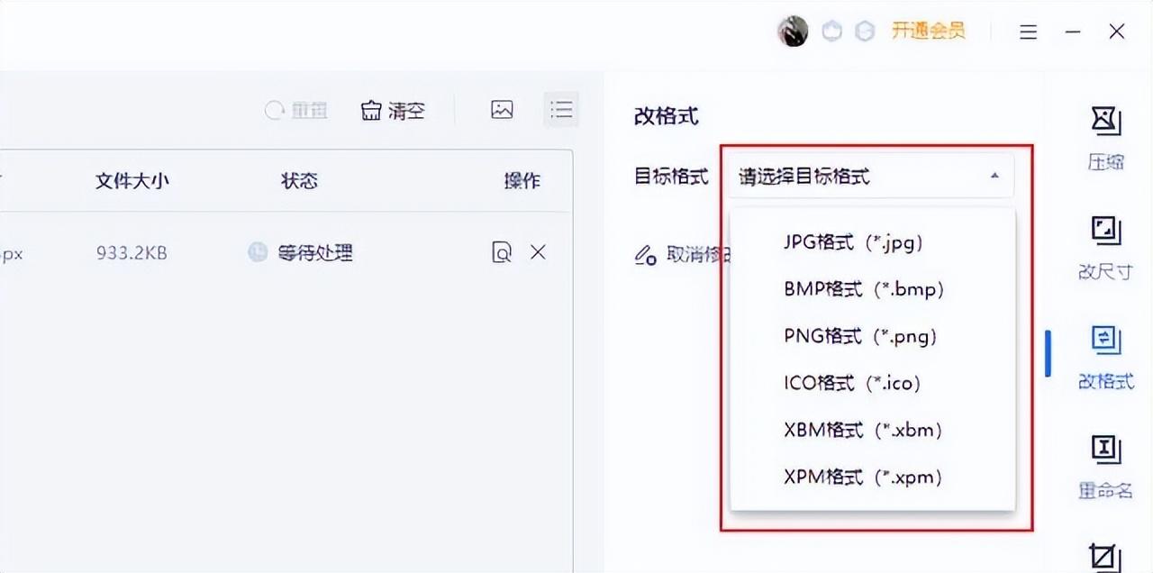 2.在目标格式一栏中选择需要转换的图片格式。不过它支持转换的图片格式较少,大家在使用前可以先看看有没有自己想要的图片格式。