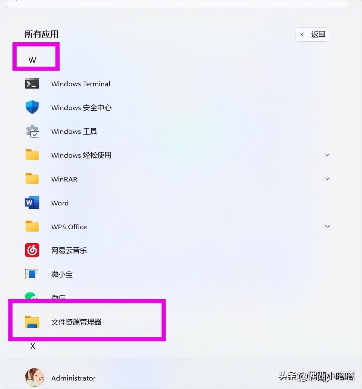 2、所有应用里w排序里的,可以看到文件资源管理器: