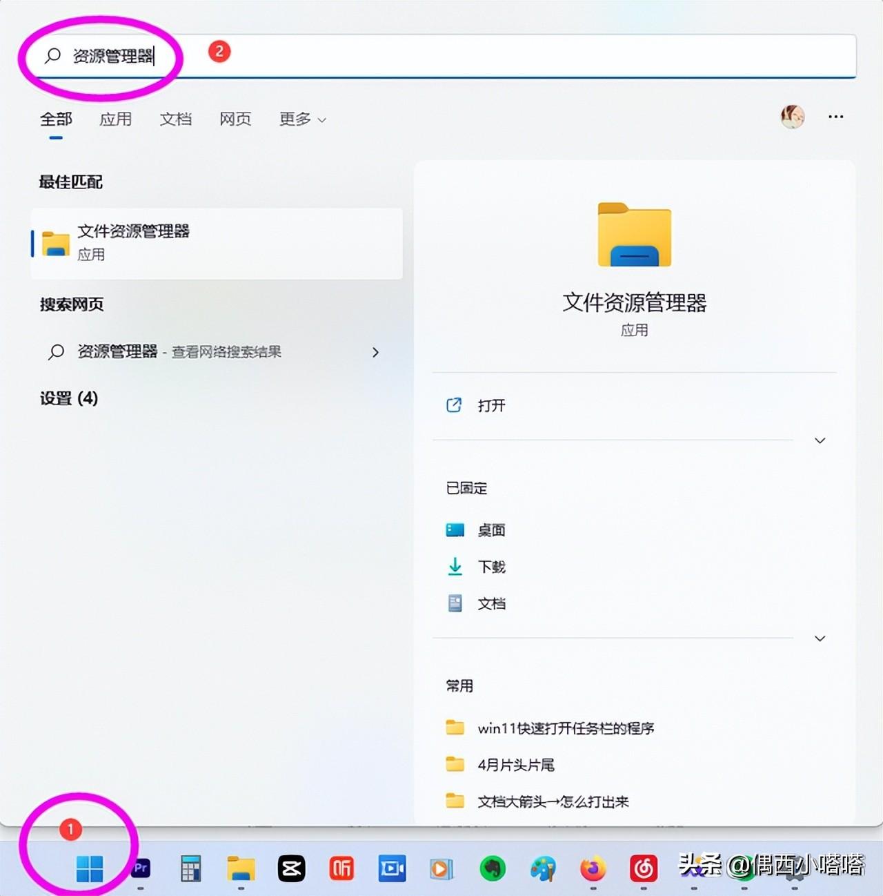 吹爆win11系统的搜索功能,直接点击开始菜单,搜索栏搜索“资源管理器”即可,如下图所示: