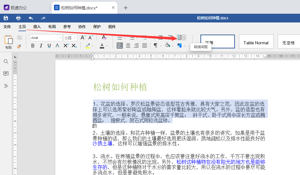1,打开你要修改的文档,选中要修改的部分,点击工具栏 主页---段线间距。