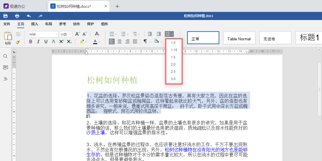 2,通过选取不同的数值,就可以改变文档每行文字之间的间距,效果如下。