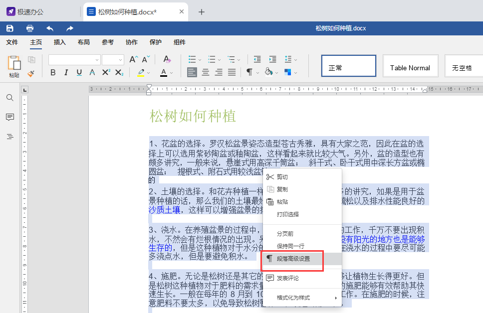 1,首先,打开你要修改的文档,选中要修改的部分,点右键--段落高级设置。