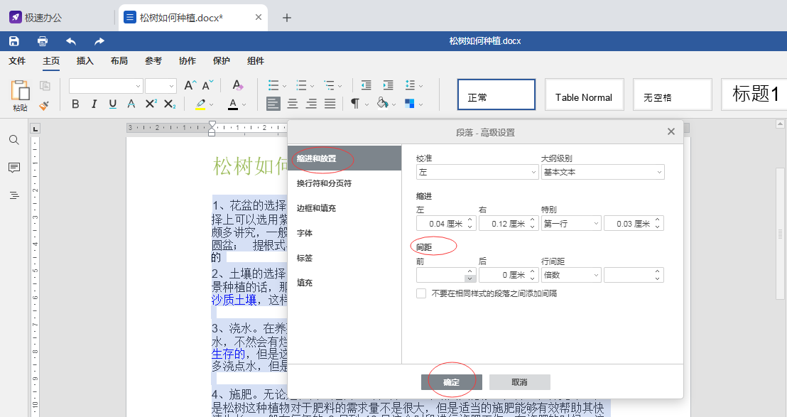 2,在缩进和放置选择间距,再更改“前”“后” 设置值,更改完成后点击确定即可。可以通过反复试验找到你满意的布局。