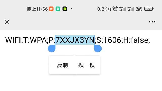 步骤6:查看WIFI密码,扫描结果中,我们只需要关注P:开始,到分号结束之间的那一部分,就是密码了,(p就是password即密码的简称)。