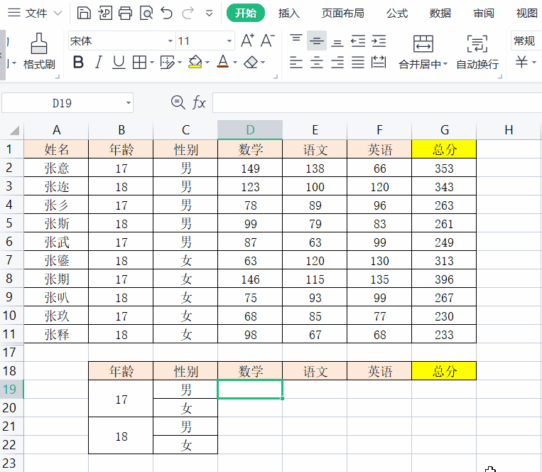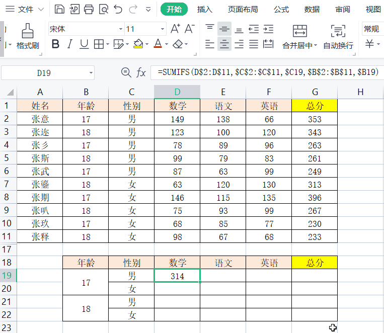 如果是多条件求和,例如想知道不同年龄的男女生考了多少分,则可以用【=sumifs(D2:D11,C2:C11,C19,B2:B11,B19)】,具体操作步骤如下:
