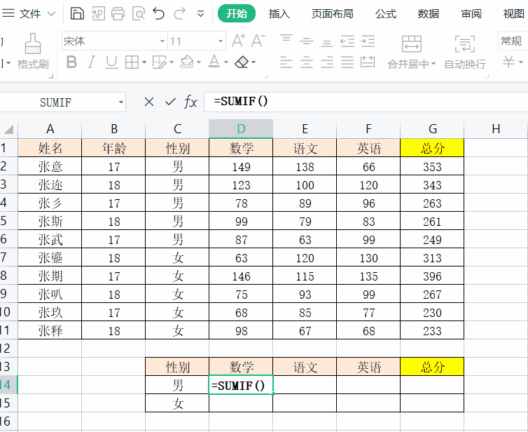 用sumif函数求男生和女生各考了多少分,可用【=SUMIF(C2:C11,C14,D2:D11)】,具体操作步骤如下: