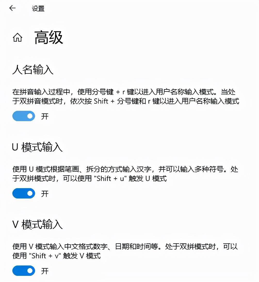 最后还有个高级设置,这里可以进行人名、U/V模式的输入,三种模式,第一种可以进入用户名词输入模式,敲出的候选词都是人名组合。U模式是根据笔画、拆分的方式输入汉字,可以让你轻轻松松敲出自己不知道怎么读,却知道怎么写的字。
