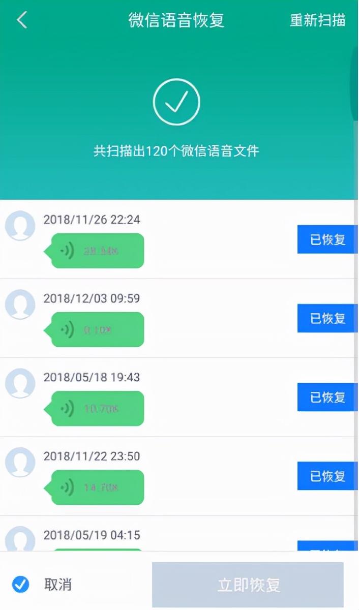 扫描完成之后即可看到显示的微信语音,勾选你需要恢复的语音,点击“立即恢复”即可完成。