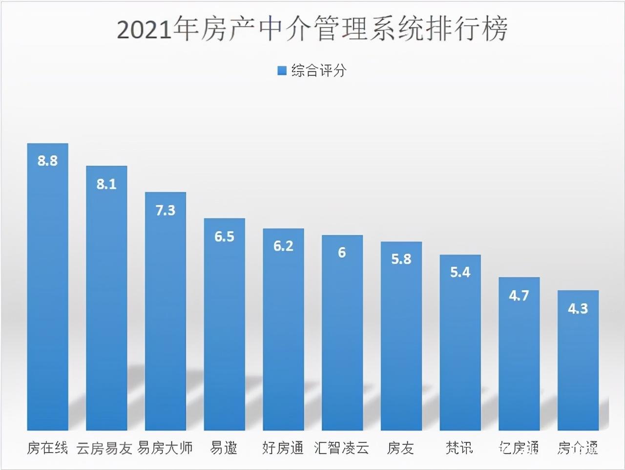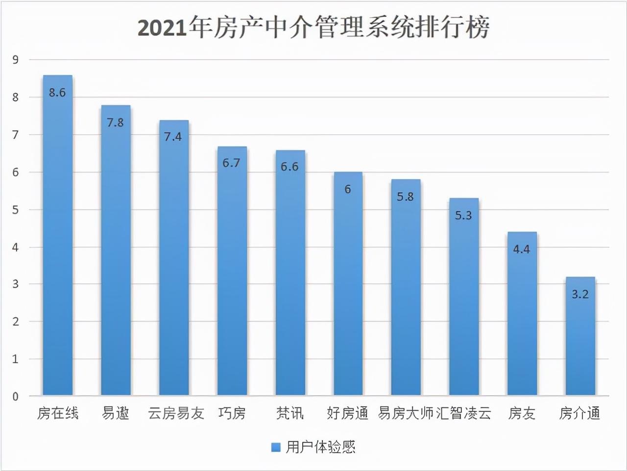 根据问卷调查得出,大部分房产中介管理者十分看重一款管理软件的售后服务,因为软件需要一个长期且持续的维护过程。针对这点,该图表得出的用户满意度(调查方式为评分,满分10分)排名为:NO.1,房在线;N0.2,云房易友;No.3,汇智凌云;No.4,巧房;No.5,梵讯;No.6,易房大师;No.7,易遨;No.8,好房通;No.9,房友;No.10,亿房通。