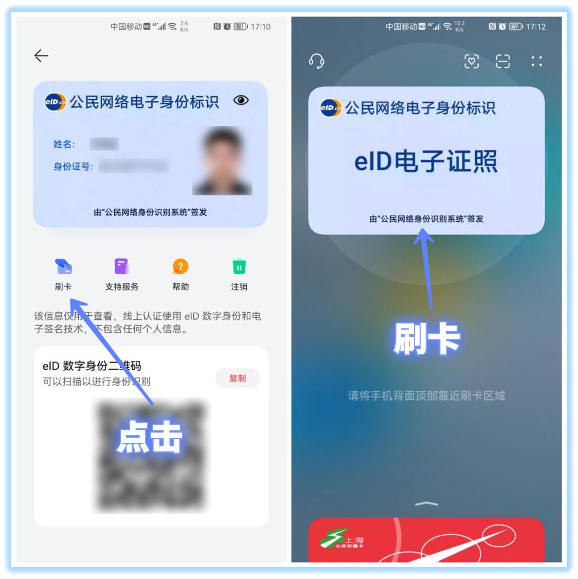 下面我们就可以查看个人电子身份证了,在生活中有需要刷身份证的地方,点击「刷卡」按钮,即可调出eID电子证照,将手机靠近刷卡区域。