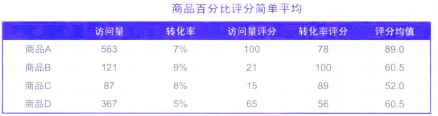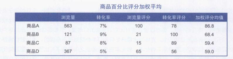 从下面的表格中知道,4种商品中访问量最高的是商品A的563 ,转化率最高的是商品B的9%。所有商品的访问量除以563,转化率除以9%,然后得到各自的百分比评分,然后将两列评分做简单平均后得到综合评分。