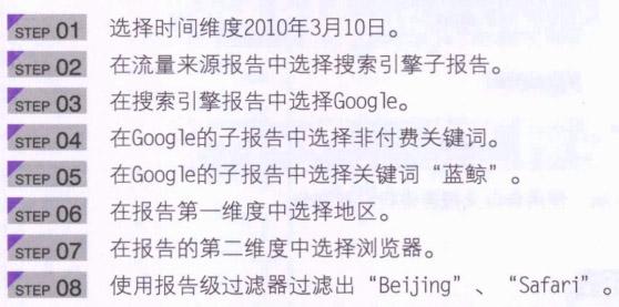 例如某日,你的老板说:我想知道2015年5月9日北京地区使用Safari浏览器在Google搜索“蓝鲸”关键词并点击了自然排名结果的访问次数。