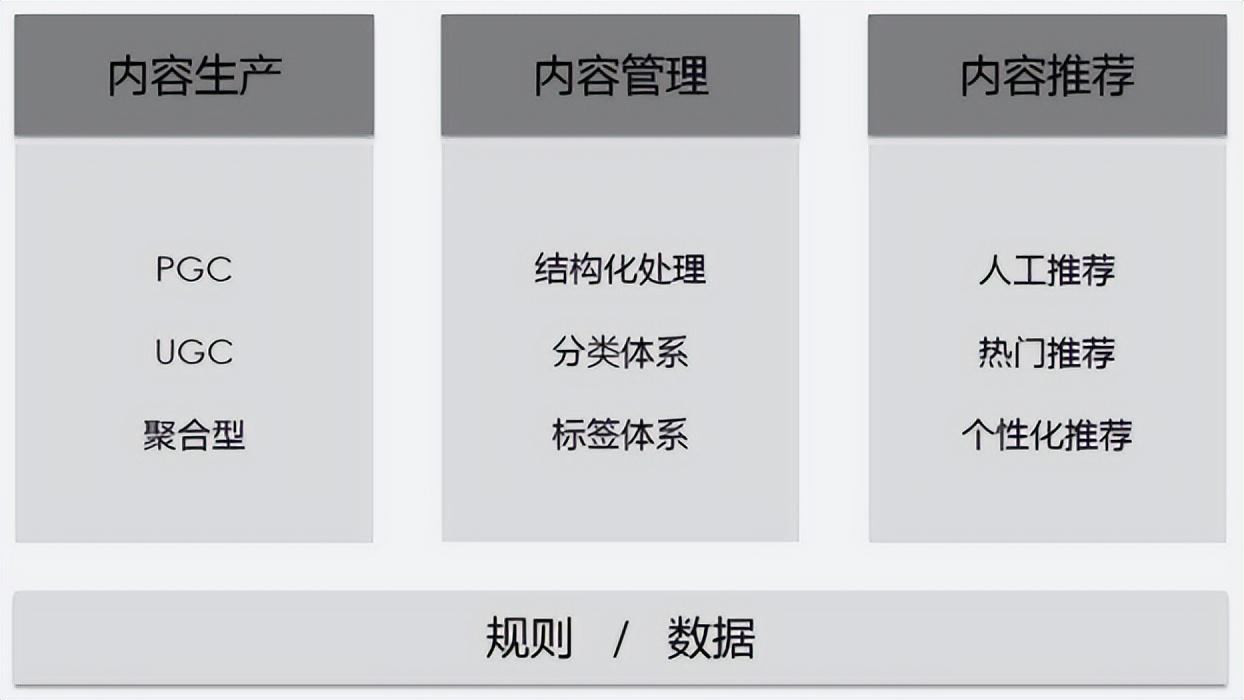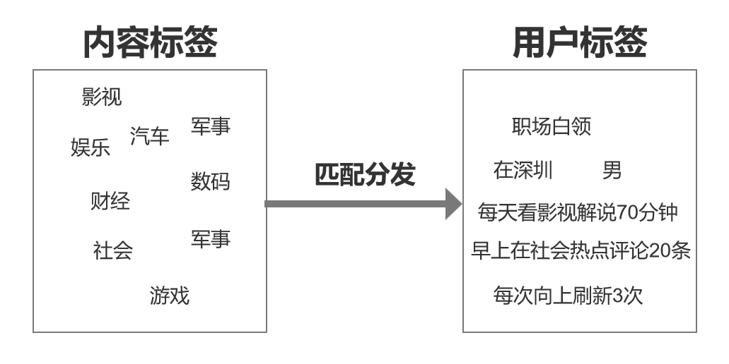 而内容运营的做法是,通过产品化手段去解决,比如个性化推荐。首先,建立一个内容库,将不同类型的内容打上内容标签,比如娱乐、军事、数码。之后,再分层用户,根据用户属性(性别、地址)和用户行为(每天看影视解说 70 分钟),将用户划分成不同的群体,打上不同的用户标签。最后,邀请产品经理和算法,根据用户标签和内容标签进行匹配,然后将不同的内容推荐给不同的用户。