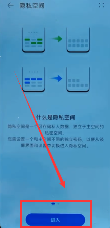 然后点击“隐私空间”,就会进入隐私空间的跳转页面(如下图)。如果是第一次使用隐私空间,需要我们创建它,很简单,按屏幕提示操作就可以了,这里就不做介绍了。